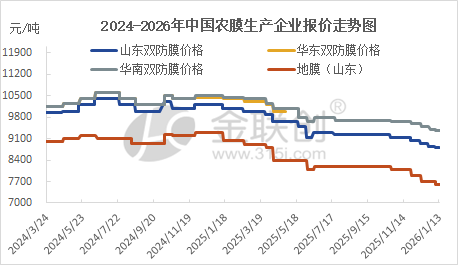 农膜市场季节性淡季格局持续,需求端跟进疲弱,北方地区棚膜需求基本结束,仅南方少量水果膜订单小幅跟进,地膜距春耕备货期尚早,暂无集中采购意愿。工厂开工负荷小幅回落,企业以刚需出货为主,整体心态偏谨慎,贸易商库存尚处于高位,降价去库意愿增强,市场流通以低价货源为主。截至2026年1月13日,华北地区双防膜主流价格在8600-9000元/吨。