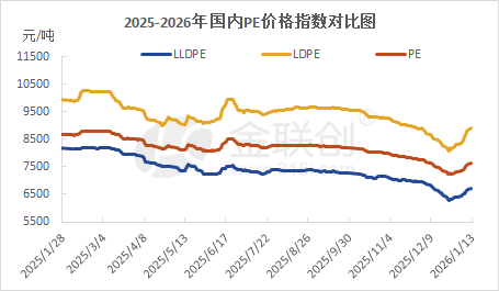 2026年开年,持续阴跌的PE市场迎来反转,在原油成本推动和进口供应意外收紧预期的双重刺激下,市场开启强势反弹行情。其中,LDPE产品涨幅一骑绝尘,成为领涨龙头,此次价格暴涨并非需求端出现根本性回暖,而是由外部因素引发的短期风暴。截止到1月13日,金联创价格指数LLDPE涨4.31%,LDPE涨6.23%,局部涨幅达10%以上,PE整体上涨3.63%;华北地区油制线型主流价格在6610元/吨。